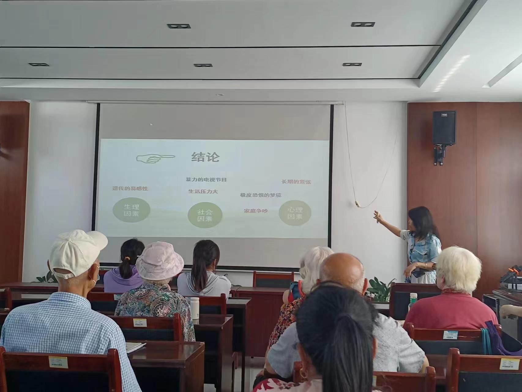 期间,董静老师通过世界卫生组织的数据和我国老年人占比讲述了当前老年人的概况。然后提出了最直接的,对老年人的评价标准“五快三良”。“五快”即“食的快、便的快、说的快、睡的快、走的快”,“三良”即“良好的个性、良好的处世能力、良好的人际关系”。并且提出了“猫脸笑”,可以在心情不好的时候用以调节心情,变得高兴。 最后,董静老师通过“梦魇”的例子,分析了生理因素,社会因素和心理因素对人健康的影响,分享了人获得健康生活的方法。