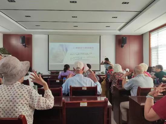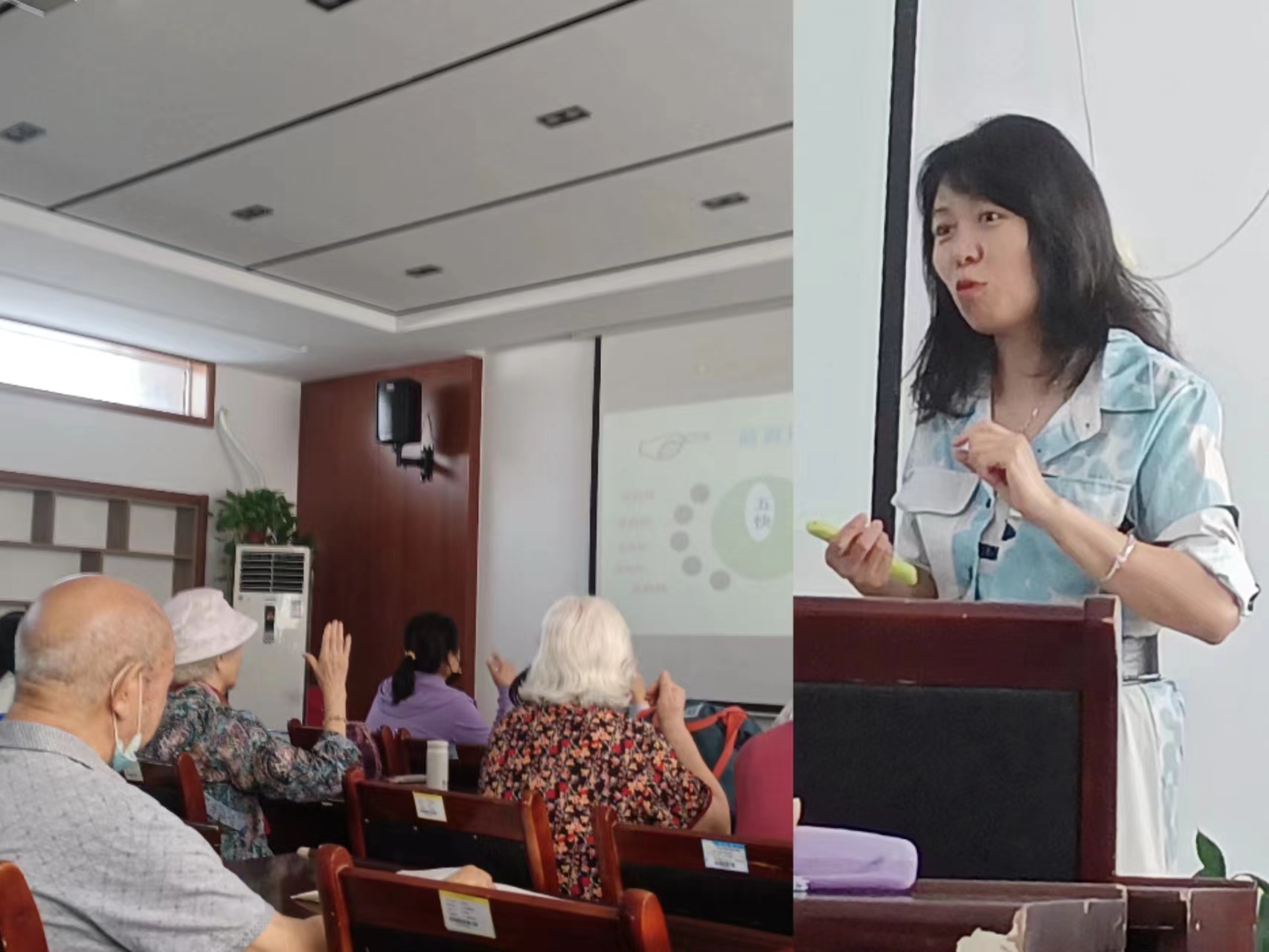 其次,课程的第二部分,董老师向大家比较说明了1990年代和2020年代不同慢性病的死亡率排名,发现慢性病已经成为致死、致残的主要元凶。董老师号召我们的老年朋友们不仅是关注自己身体上的变化,而且要关注心理上的健康,心理健康和身体健康同样重要。心理健康是身体健康的前提,没有一个健康的心理就会导致各种疾病,老师在课堂上利用自己的所学,为学员们教授了一个心理调节的方法,就是“猫脸笑”,即手部做猫脸的动作并哈哈笑以缓解烦闷的情绪。
