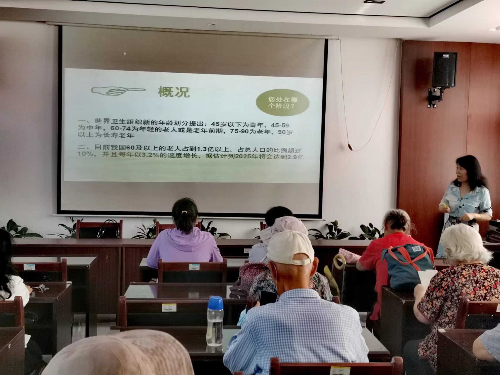 在双方深入的互相了解后,董老师为大家带来了精心准备的专业的且具有针对性的心理学“干货”。首先,董老师向社区学员以生动有趣的语言科普世界卫生组织的年龄划分,将60-74岁为年轻的老人或老年前期比喻为“老年人的学前期”,活跃了课堂氛围,也缓解了老年人对自己现阶段的年龄焦虑。
